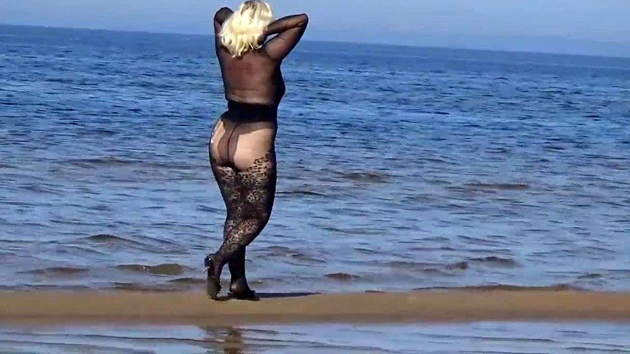Black style milf flashes big tits on the beach